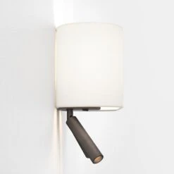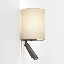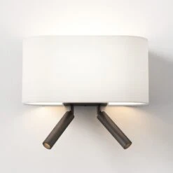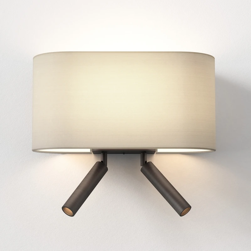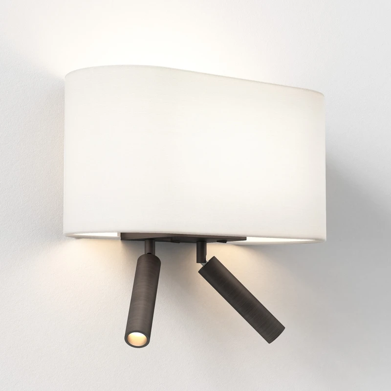 - This modern, sleek design is both stylish and functional. Made from die-cast zinc in a bronze finish, it features a rectangular backplate with single lamp holder and 2 adjustable reading lights, with integrated warm white LED light. Operated by a rocker switch on the base of the wall plate and is sold as the wall fitting only, the shade needs to be purchased separately. This versatile design is ideal as a bedside reading light.