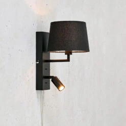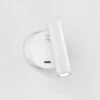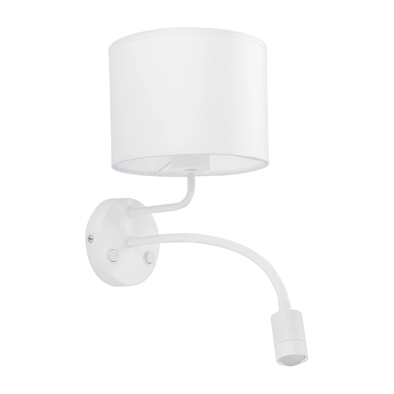 - Metal wall light with snake arm reading light and fabric shade in a white finish