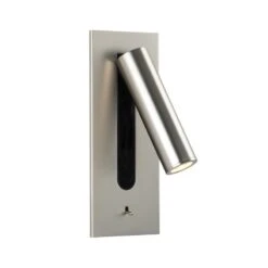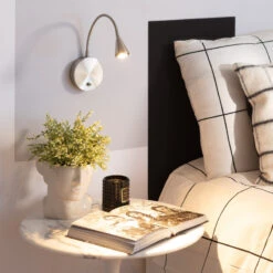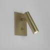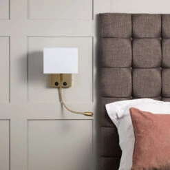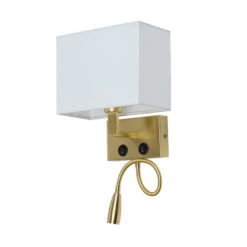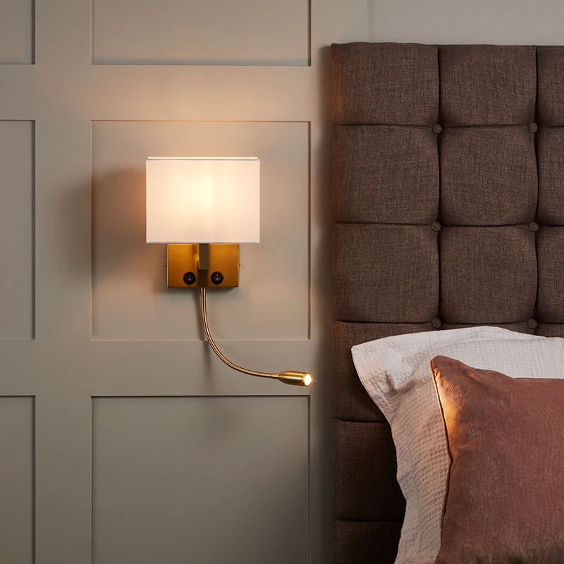 - Wall light in a brushed brass finish with white fabric shade and LED reading light