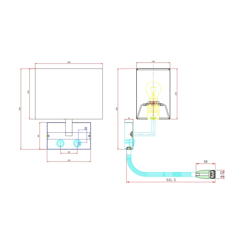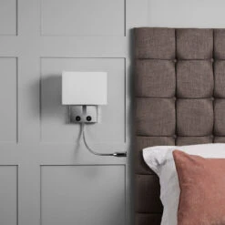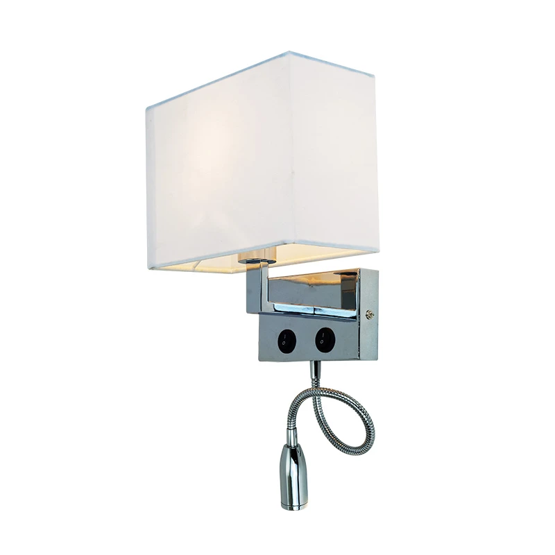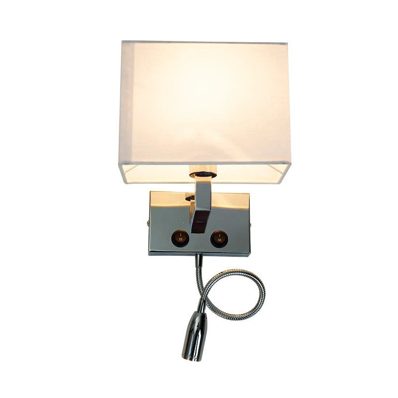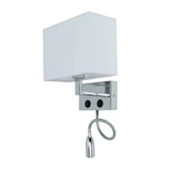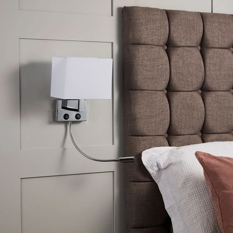 - Wall light in a polished chrome finish with white fabric shade and snake neck reading light containing 1W LED