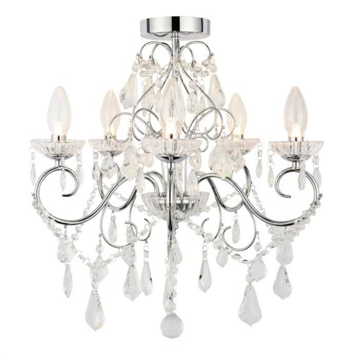 The Vela 5 Light Semi-Flush forms part of the Forum Lighting ‘Spa’ range. This elegant chandelier features a polished chrome finish, multifaceted glass droplets, and five clear glass candle sconces. Unusually for such a glamourous luminaire, it has an IP44 rating that certifies suitability for bathroom use. The Vela is also ideal for a living room, dining room, or bedroom and a wonderful lighting choice for a home, hotel, B&B or spa.